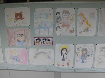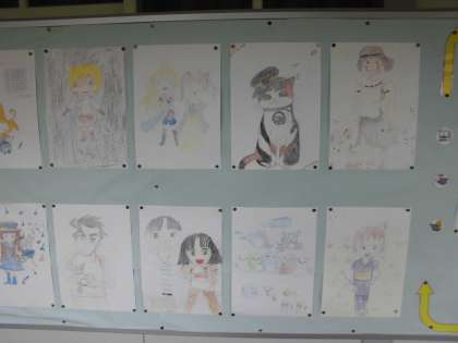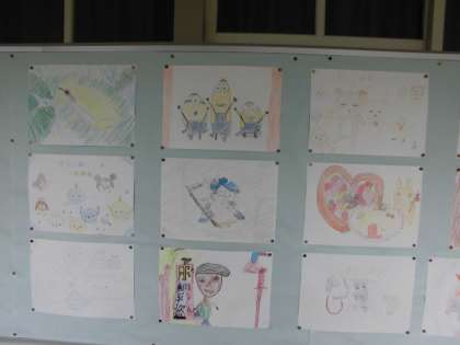 夏休みも残り10日をきりました。南舎2階のパソコン室前には、1学期中に作ったイラストが掲示されています。大好きなキャラクターを上手に描くことができました。2学期には、手作り絵本を作ります。楽しみですね。
