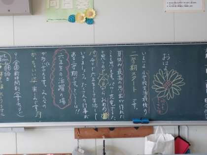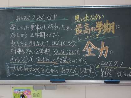 さあ、いよいよ明日から2学期がスタートします。2学期は、運動会、遠足、6年生は、修学旅行と楽しみなことがたくさんあります。学校では、子どもたちを迎える準備がすみました。明日の始業式では、笑顔いっぱいの子どもたちに会うのが楽しみです。