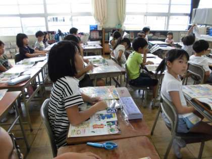 2年生の図工の様子です。カッターナイフで紙にいろいろな切り込みを入れてできる窓を開く仕組みを使って,思い付いたものを表すという授業を行います。今日は、家や窓の形,窓の開き方や窓の中に見えると楽しいものを考えました。