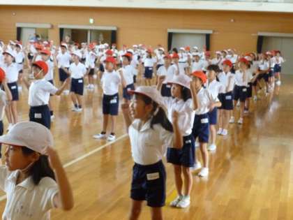 運動会の練習を始めました。1年生と一緒に踊りの練習をしました。先生の踊りを見ながら、一つ一つ覚えていきました。子どもたちは覚えが早く、また、リズム感の良さに驚かされます。