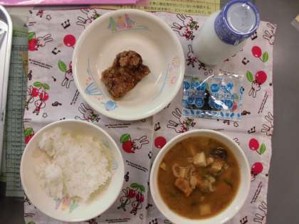 秋なすとかぼちゃのみそ汁 鶏肉の竜田揚げ ご飯 牛乳 佃煮