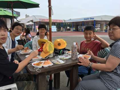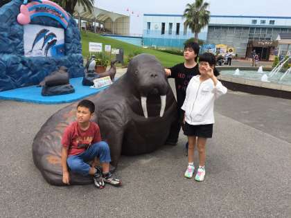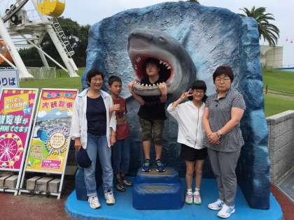 宿泊学習で、南知多ビーチランドにいきました。お弁当を食べて、記念写真を撮りました。