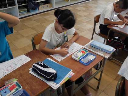 裁縫の授業が行われています。今日は練習布を使って本返しぬいの練習をしました。みんな、先生のお話をよく聞いて、真剣な表情で取り組んでいました。
