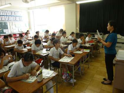 英語活動では、一宮市の公共施設について練習しました。市民会館や博物館など、英語での表現を指導しました。