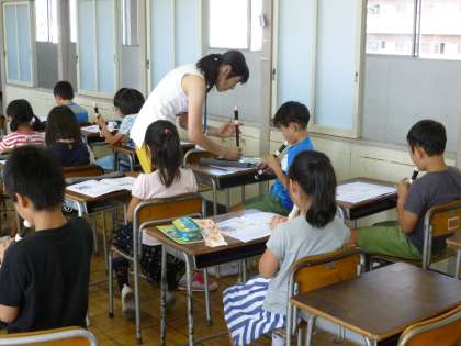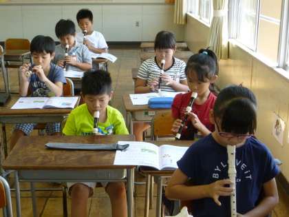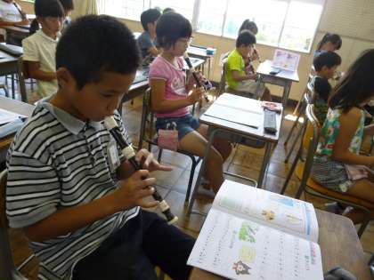 音楽では、リコーダーの練習をしています。今日は、「かっこう」の曲をふきました。息が漏れないよう、しっかり穴を押さえて吹かせました。