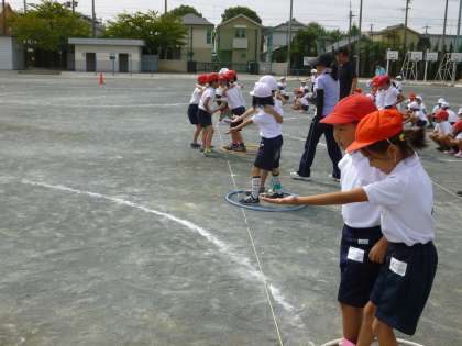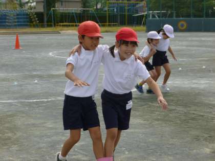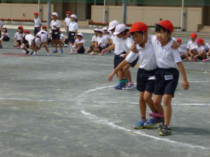 運動会で行う競争遊戯の「息を合わせて一歩ずつ」の練習をしました。二人三脚で、子どもたちは、二人で声を掛け合って一生懸命前へ進みました。