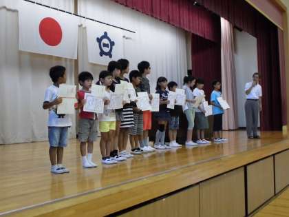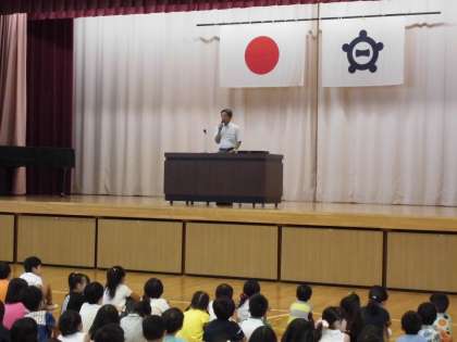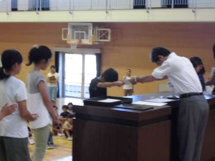 本日の朝礼では、発明工夫作品コンクールの入選や感謝状の表彰伝達を行いました。その後、校長から昨日の運動会を振り返り、みんなの頑張りをほめました。