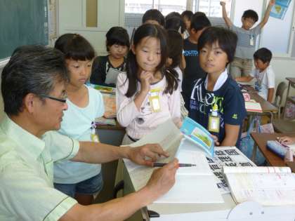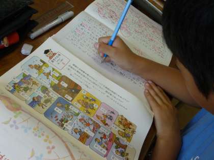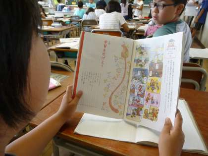 絵を見て昔話の続きを書かせました。その際、絵の中に書かれている言葉を必ず使って、昔話を書くことになっています。子どもたちは、その言葉を必ず入れようと、いろいろと考えを巡らせて話を書きました。