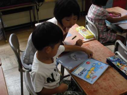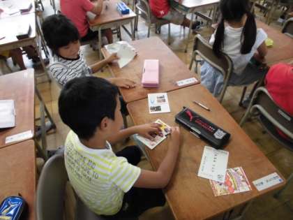 「どちらのえんぴつが長いかな」「どちらのひもが長いかな」「はがきやノートのたてとよこは、どちらが長いのかな」と、長さの違いを確かめる方法を友達と考え、発表しました。