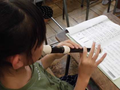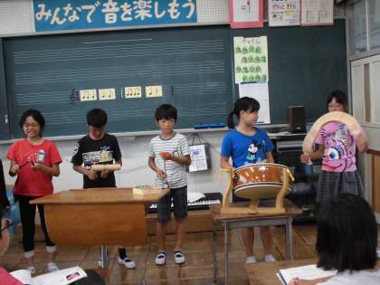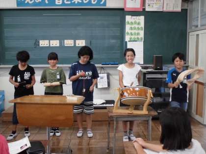 5時間目の音楽の授業では、異なる旋律を重ねて音楽を表現しました。最初はリコーダーで「星笛」を合奏しました。そして、さまざまな楽器を用いて「こきりこ節」を合奏しました。とても上手にできました。