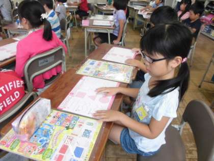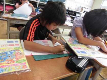 2年生の図工の授業の様子です。カッカーナイフの使い方を練習カードを用いて行いました。直線、波線、ギザギザなど、いろいろなかたちで切る練習を行いました。みんな上手にカッターナイフを使うことができました。