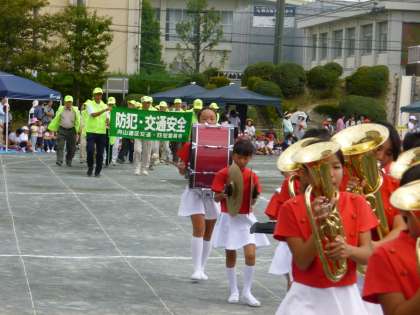 午後には、金管バンド部がマーチングをさせていただきました。いつものように素晴らしいマーチングでした。最後は、連区の交通安全の皆様と一緒にグラウンドを一周しました。