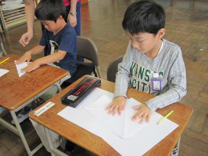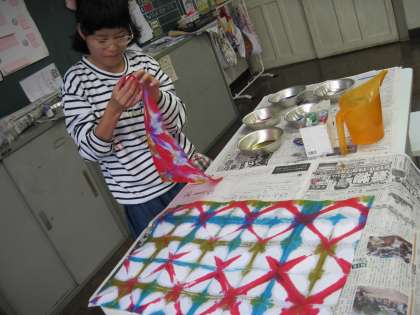 和紙を使って染め紙をしました。角を合わせて三角や四角に紙を折り、好きな色で染めました。紙をひろげるときにどのように染まっているかわくわくしました。