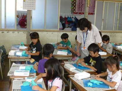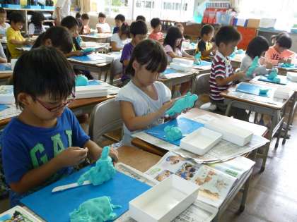 一緒に散歩をしている様子を粘土で表しました。最初は、固まりを作り、そこから一緒にいる人と自分を分けて作るよう指導しました。子どもたちの豊かな発想があちこちに見られました。