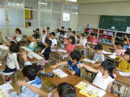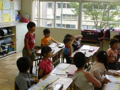 漢数字の学習をしています。数字にも漢字があることを理解させ、一つずつ書き順や気をつけるところを説明しました。それから、ドリルを使って練習させました。