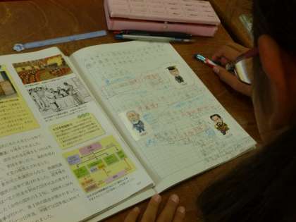 子どもたちのノートには、人物絵のシールが貼られ、学習したことが整然と書かれています。しっかりと学習に取り組んでいます。