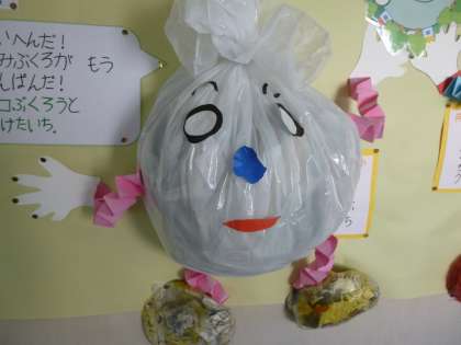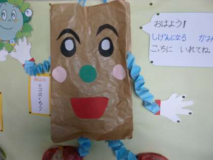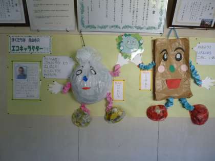 向山小のエコキャラクターが職員室前の掲示板にやってきました。名前は「わけたいち」と「エコぶくろう」です。子どもたちのアイデアから生まれたエコキャラクターは、とてもかわいらしく微笑んでいます。
