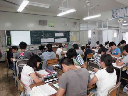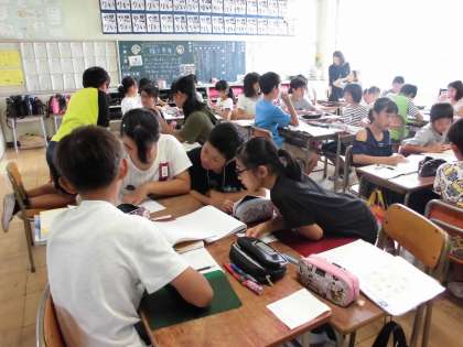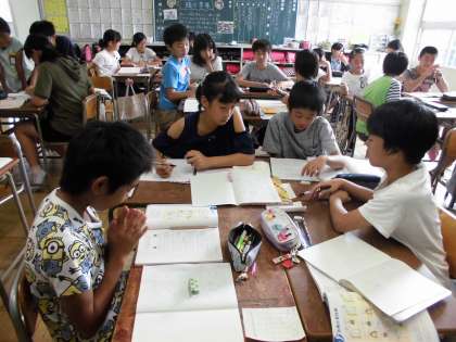 算数は「比例と反比例」の学習に入りました。今日は、ともなって変わる2つの量を見つけ、その表の変わり方を自分で考えた後、グループで話し合いました。他学年が校外学習へ行き静かな学校で、6年生は勉強をがんばっています。