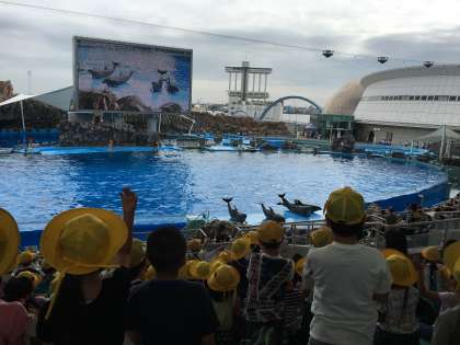 2年生の校外学習の様子です。イルカのショーを見ました。高いジャンプやスピンやスライダーなどの沢山のイルカの特技を見て、子どもたちも大喜びでした。