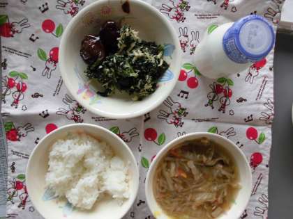 ☆今日の献立  中華スープ 肉団子 ほうれん草のささみ和え ごはん 牛乳