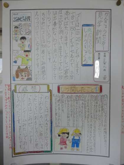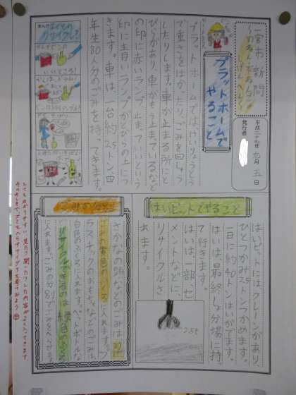 ごみや資源についての学習のまとめとして、一宮市環境センターへ見学に行きました。そこで学んだことをもとにして「環境新聞」を作りました。各自がテーマをもって、見やすくてわかりやすい新聞にしました。4年生3クラスとも廊下に掲示してありますので、来週の学校公開でご覧ください。