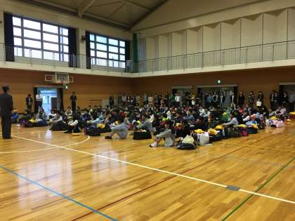いよいよ待ちに待った修学旅行です。雨天ではありますが、6年生全員が揃って元気な顔で屋内運動場に集合しました。代表児童の司会のもと、出発式を行いました。多くの保護者の方々に参加していただき、元気に出発です。