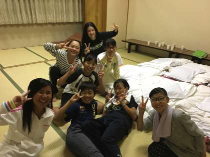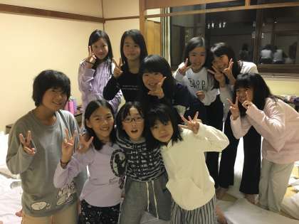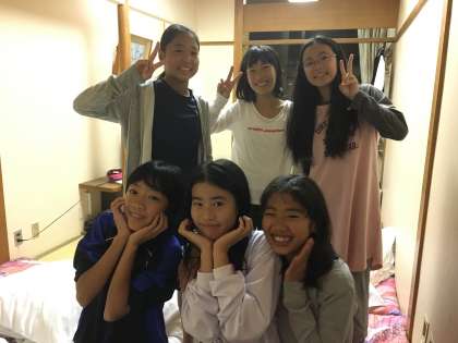 修学旅行の様子です。入浴を終えて、お部屋のみんなと就寝準備です。