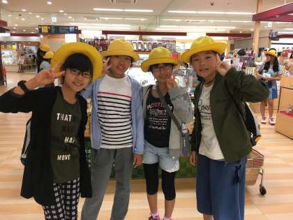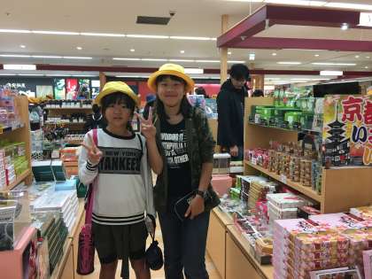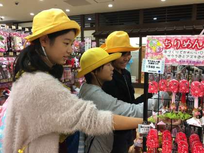 修学旅行の様子です。映画村でお土産を買っています。お小遣いを上手に使い計画的な買い物ができました。家族にも自分にも買って、満足そうな笑顔です。