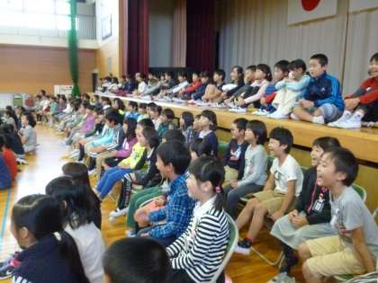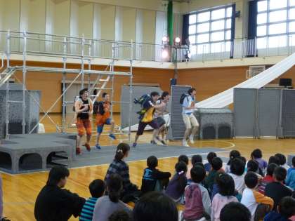 劇団「風の子」に来ていただき、「スクラムガッシン」という劇を見ました。工夫されたステージ構成と、子どもたちの心をつかんだ演技にどの子も目をキラキラさせて見入っていました。