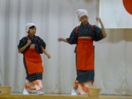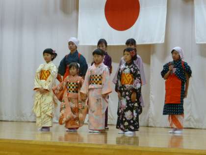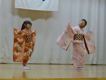 向山小学校の児童たちが学校外活動として、日本舞踊の稽古をしています。敬老会のステージで披露しました。扇子・傘・花を持ち、曲の雰囲気に合うしなやかな動きで表現することができました。