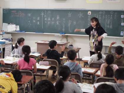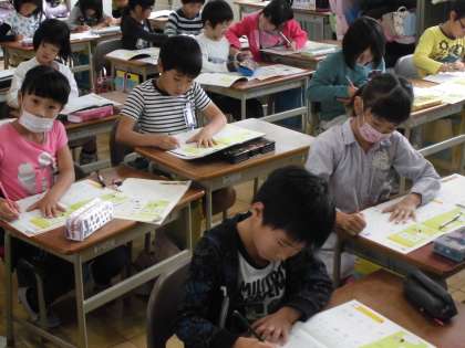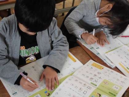 書写の時間に、「水」「東」「車」「米」「半」「当」などの漢字を、モズの中心を意識して練習しました。先生の言うことをよく聞いて、練習ノートに集中して取り組んでいました。