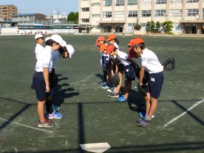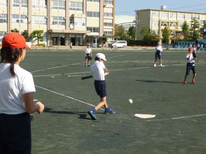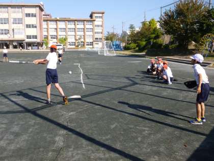 体育では、ソフトボールの練習をしています。今日、キャッチボールの後、チームで試合をしました。得意な子がみんなをまとめ、楽しく試合ができるよう工夫しました。