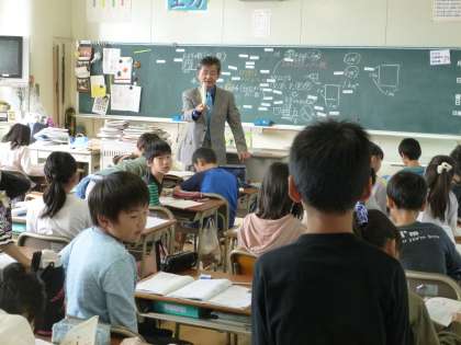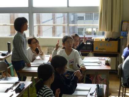 算数では、概数についての学習を進めています。今日は、一の位まであらわされた人口を四捨五入によって概数にする方法を説明しました。