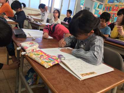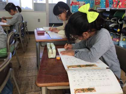 2年生の書写の時間の様子です。ます目に書くときのきまりについて、学習をしました。書き順に気をつけて、形を整えながら、丁寧に清書することができました