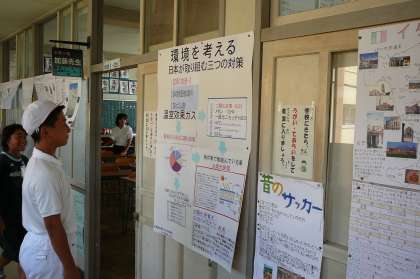 風が気持ちよくふきぬける廊下には、夏休みの自由研究がはりだしてあり、それを子どもたちは興味深く見ています。