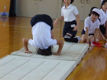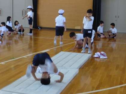 体育では「マット運動」の練習をしています。今日は、マットを2枚続けて、連続技の練習をしました。前転や後転などを組み合わせて、最後は、両手をあげてフィニッシュの姿勢をとらせました。