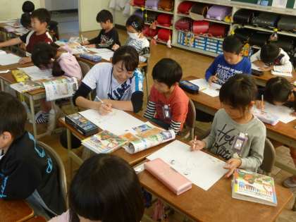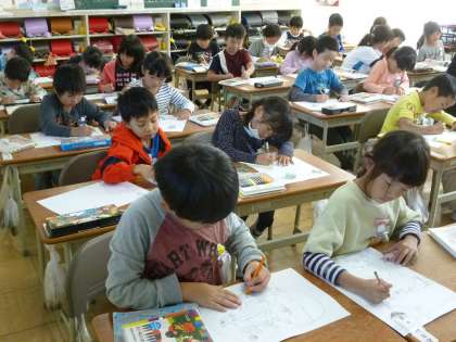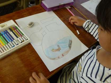 「あなのなかには」というお話を聞いて絵をかかせています。穴の中には、何がいるのか、一人一人が想像力を働かせて絵をかきました。子どもたちの豊かな発想には、いつも驚かされます。
