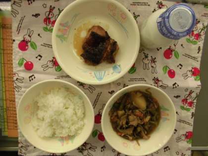 肉じゃがは日本料理のひとつで、西日本では牛肉、東日本では豚肉を使うのが一般的だそうです。今日の給食では東日本風に豚肉を使いました。明治時代にビーフシチューのレシピをもとにして日本海軍で作られたものが起源という説があります。じゃがいもには、加熱しても壊れにくいビタミンCが多く含まれています。