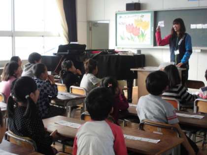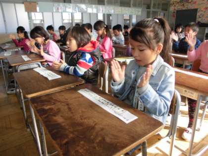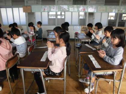 2年生の音楽の授業の様子です。「村まつり」のおはやしの部分に、創作リズムを入れて打つ練習を行いました。4小節のおはやしの中に、掛け声も入れながら、上手にリズムを入れることができました。