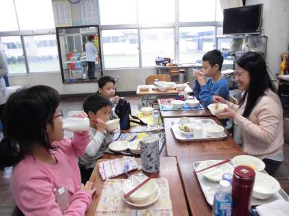 今日は、マリアン先生と一緒の給食です。「まだかな、まだかな〜」とマリアン先生を待っていました。とってもうれしいのに、はずかしくてなかなか話しかけられないのでした。マリアン先生からメニューを英語で教えてもらいました。