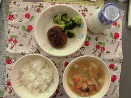 ポトフ ハンバーグのバーベキューソース ブロッコリー ご飯 牛乳