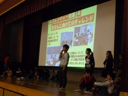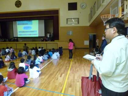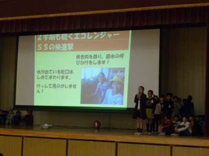 児童集会で、4年生の「エコスクール活動」の取り組みを発表しました。水、電気、そして、紙などの資源回収について、今までの自分たちの取り組みを説明しました。社会科で見学させてもらった環境センターからも職員の方にお越しいただき、発表を聞いていただきました。