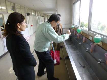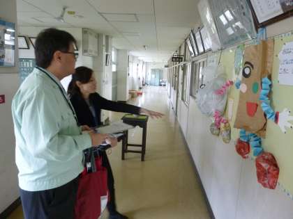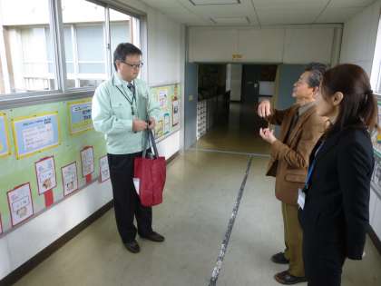 環境センターから職員を招き、本校のエコスクール活動の様子を見ていただきました。4年生の担当者から、本年度の取り組みや掲示物の説明をしました。また、職員室や資源置き場の分別の様子も見ていただきました。