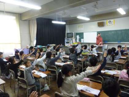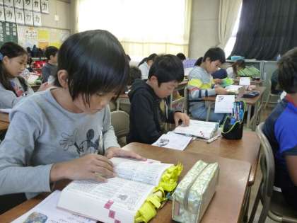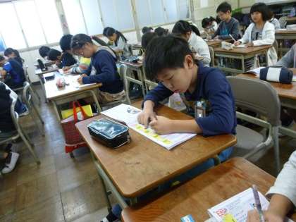 漢字ドリルを使って漢字の学習を進めました。書き順や読み方など、声に出して復唱させてから、書かせました。リズムにのって、全員が集中して学習に取り組みました。意味が分からない時は、国語辞典で調べさせました。調べた言葉には、付箋をつけています。その付箋の数に驚かされます。