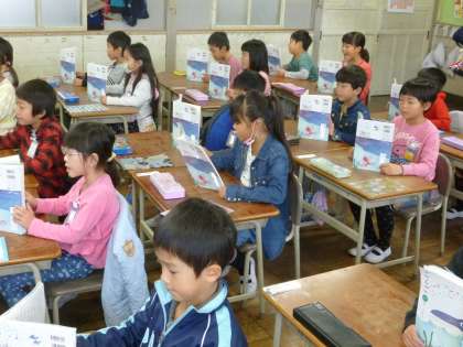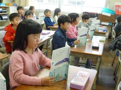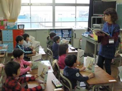 「働く自動車」を比べて説明してある文章の読み取りを進めています。今日は、教師のあとをついて全員で音読をしました。