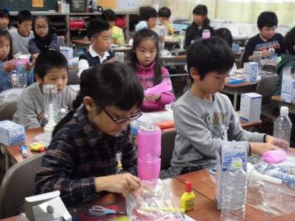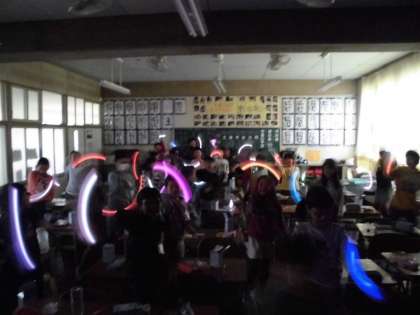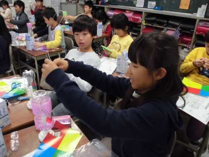 図工で「クリスタルファンタジー」という光を使って作品を楽しむ教材があります。今日は、初めに部屋を暗くしてライトをつけてその様子を観察しながら、作品の構想を練りました。その後、実際に明かりをつけながら作品を作りました。