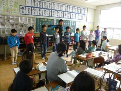 算数では「人文字」というところの学習を進めています。10mに1m間隔で人が立つと何人必要なのか、実際に立たせて数えてみました。その長さと立つ人数とには、どのような関係があるかを考えさせました。