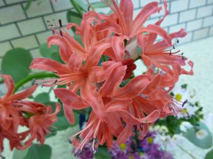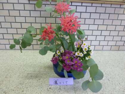 「ダイヤモンドリリー」と「ユーカリ」の葉、そして、「スプレー菊」で、凛とした装いを表してみました。