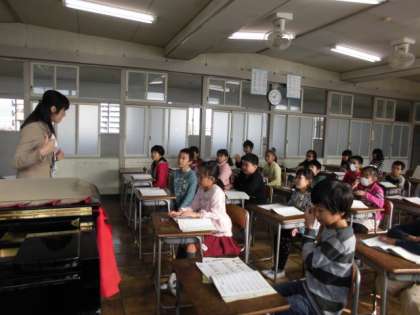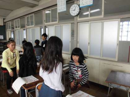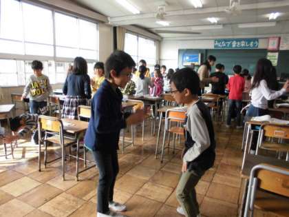 3年生の音楽の授業の様子です。常時活動では2〜3人のグループで、拍の流れにのって、手合せを行いました。3拍子のリズムに上手にのることができました。
