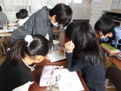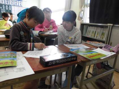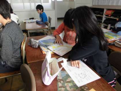 4年生の社会の授業の様子です。都道府県名について学習を進めています。日本地図を調べ、用意されたプリントに友だちと相談しながら、記入することができました。